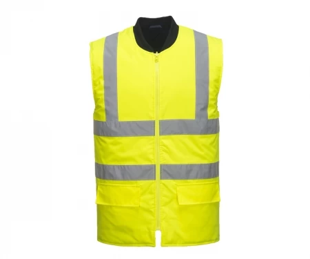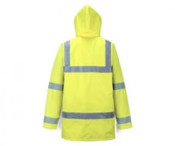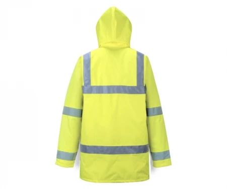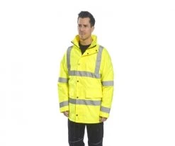 The US468 by PortWest is an ANSI Class 3 high visibility yellow, 4-in-1 traffic jacket. Made with 100% polyester, 300D oxford weave, this jacket is also stain resistant with a PU coated finish. 14 oz. Fur lining provides additional comfort and warmth. Waterproof sealed seams, a pack away adjustable hood and elasticated cuffs are also featured with this design. 8 Pockets are located throughout this jacket. 4-in-1 functionality is achieved with by removing the internal, reversible body-warmer vest. This hi vis workwear meets ANSI Class 3 standards with 2″ silver reflective tape.