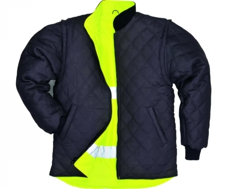 The US427 by Portwest® is an ANSI Type R Class 3 high visibility 7-in-1 traffic jacket. This jacket is made with 100% polyester 300D Oxford weave and also has a stain-resistant PU coated finish. This waterproof jacket features sealed seams, a pack away detachable hood, adjustable cuffs, and a detachable inner reversible body-warmer vest with removable sleeves. A mic tab, badge holder, ID window, and radio pocket are featured in front. This hi-vis workwear meets ANSI Class 3 Standards with 2″ silver reflective tape which aligns the jacket.