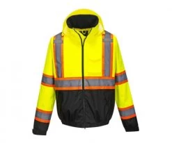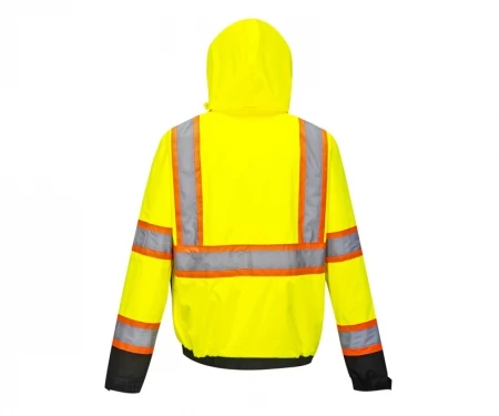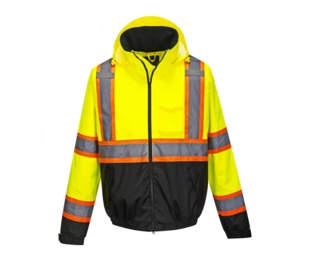 The PortWest US367 Hi-Vis Contrast Bomber Jacket w/ Polyester Fleece is an ANSI Class 3 high visibility bomber jacket with a black bottom and contrasting two-tone reflective tape. This jacket is waterproof with sealed seams and has a pack away adjustable hood. The bomber jacket also comes with a detachable fleece liner which provides extra warmth and comfort. A variety of 5 pockets are located throughout the jacket while the front features 2 microphone tabs. This hi vis workwear meets ANSI Class 3 Standards with 2″ silver reflective tape which features a contrasting orange backing trim.