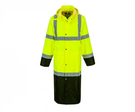 The Portwest UH443 Hi Vis Contrast Rain Coat is an ideal choice rainwear or foul weather protection. This long coat is 48” in length and sports both  2” silver reflective tape and contrast material for added visibility and dirt protection. . As the name implies, this Hi vis jacket is fully waterproof with sealed seams.