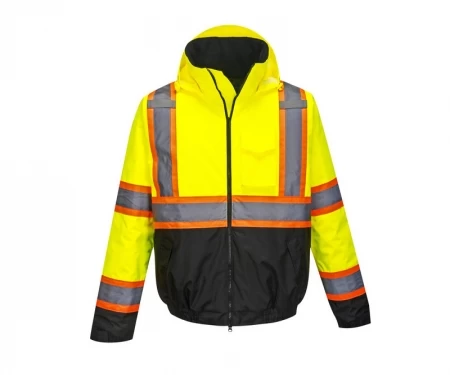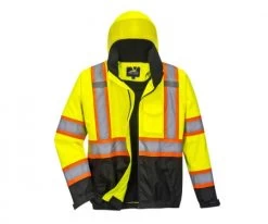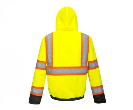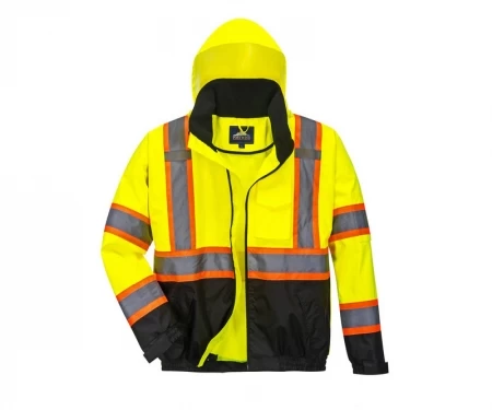 The Portwest US368 Hi-Vis Bomber Jacket with Reflective Contrast Tape is an ANSI Class 3 high visibility, two-tone, black bottom bomber jacket. This jacket is made with 100% 300D Oxford Weave polyester and features a stain resistant PU coating. Waterproof functionality is achieved with sealed seams and a pack away adjustable hood. 2″ silver reflective tape with a 4″ orange backing aligns the jacket.Â
