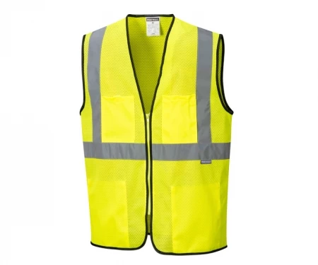 The Portwest US380 Hi-Vis Tampa Mesh Vest is a Hi-Vis sleeveless mesh safety vest that is lined with 2” silver reflective tape. The Vest is made with 100% Polyester Mesh and has 4 pockets on the front.
