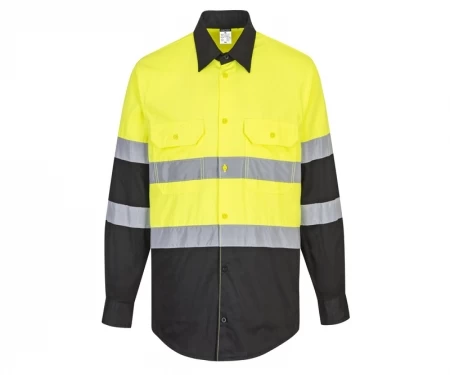 The Portwest E066 Two Tone Long Sleeve Dress Shirt  is a Hi vis long sleeve shirt made from Kingsmill: 65% Polyester, 35% Cotton 5.5oz. This work shirt has a vented back to keep the user cool. This long sleeve shirt uses 2” silver reflective tape for added visibility.