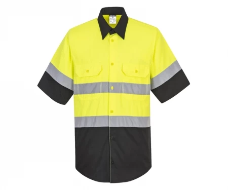 The Portwest E067 Two Tone Short Sleeve Dress Shirt is a hi vis short sleeve shirt made from Kingsmill: 65% Polyester, 35% Cotton 5.5oz. This work shirt has a vented back to keep the user cool. This short sleeve shirt uses 2” silver reflective tape for added visibility.